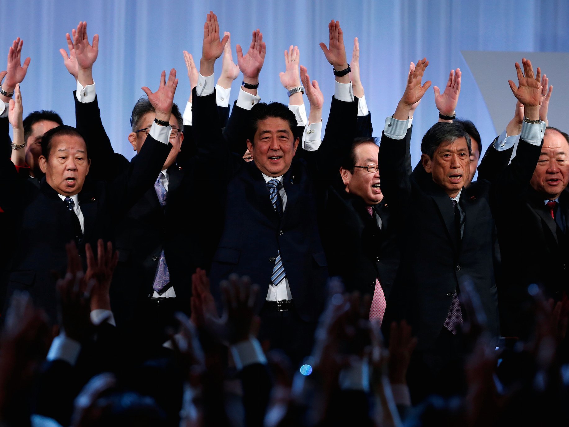 Japan’s Prime Minister Shinzo Abe (C) shouts “Banzai!” (cheers) as he raises his hands with members of the ruling Liberal Democratic Party (LDP) during the annual party convention in Tokyo, Japan.Reuters/Toru Hanai