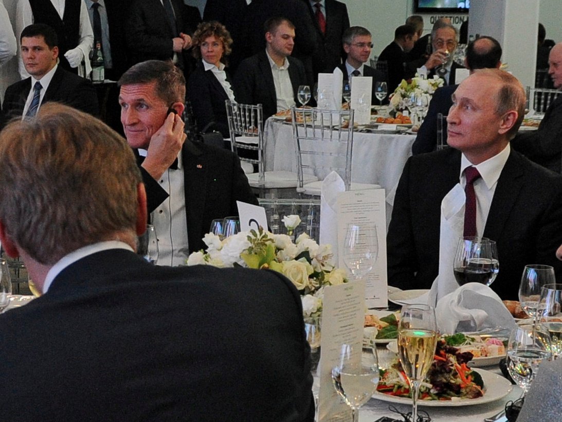 Russian President Vladimir Putin (R) sits next to retired U.S. Army Lieutenant General Michael Flynn (L) as they attend an exhibition marking the 10th anniversary of RT (Russia Today) television news channel in Moscow, Russia, December 10, 2015.Reuters/Sputnik/Mikhail Klimentyev/Kremlin