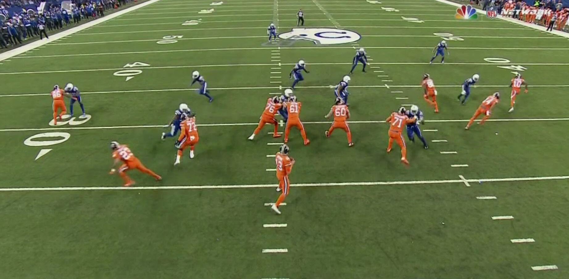 The first play came on the opening drive of the game. With the Broncos moving the ball, the drive came to an abrupt end when quarterback Trevor Siemian threw an interception. With the Skycam view, fans at home could see in real time how horrible the pass was as Siemian inexplicably threw the ball right into double-coverage for an easy interception.