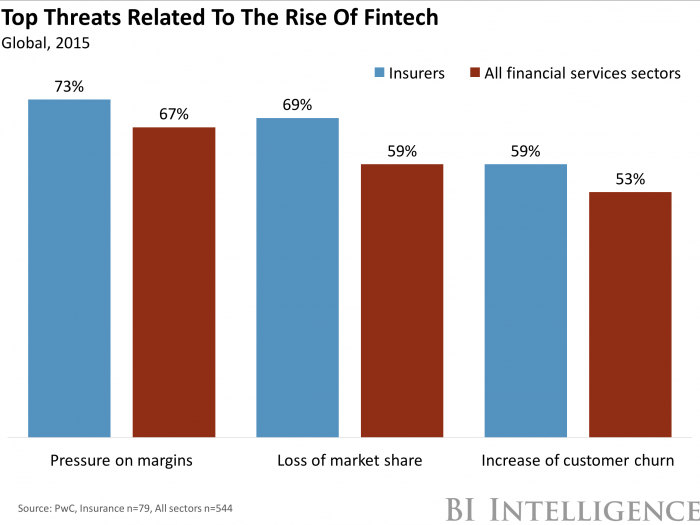 PwC released a report this week that revealed 90% of insurers fear losing at least part of their business to standalone fintech companies, and approximately half of that 90% believe they could lose up to 20% of their business. The report surveyed 79 executives at worldwide insurance companies.