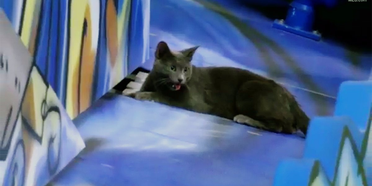 As the cat ran along the wall and toward a sign, it climbed a chain link fence into the Marlins’ home-run sculpture, which activates when the Marlins hit a home run. The announcers were baffled by the cat’s athleticism.