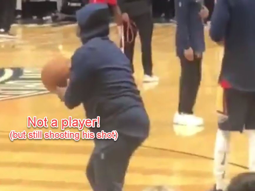 The video shows a fan in a Pelicans warmup jacket walking onto the court and stretching as the Pelicans players are warming up. The fan eventually called for a ball and then took a shot after somebody obliged.