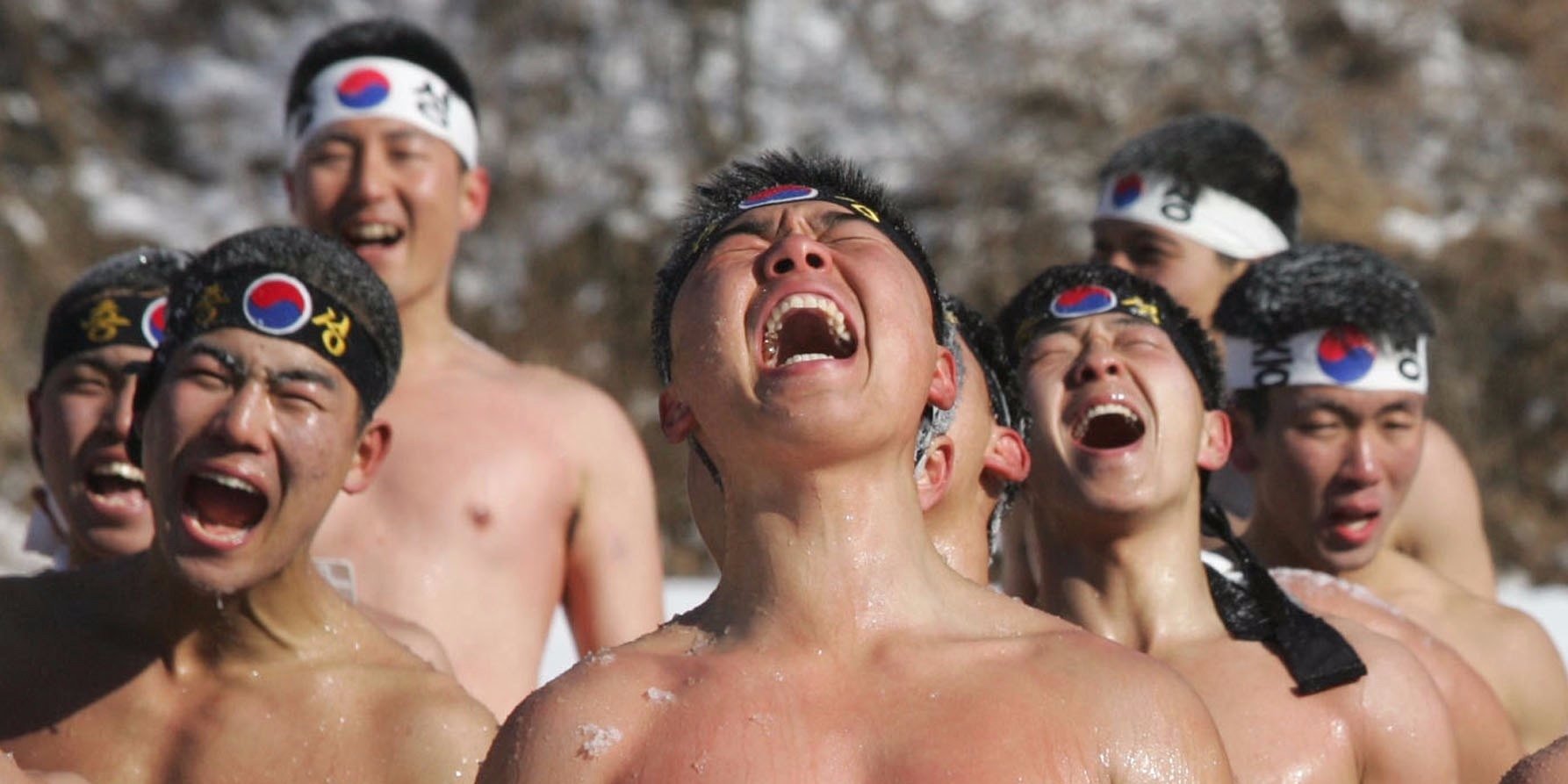 South Korean special warfare forces scream during winter mountain training exercises on January 10, 2007 in PyeongChang, South Korea. The Korean peninsula is the world’s last Cold War frontier as Stalinst North Korea and pro-Western South Korea have been technically at war since the 1950-53 conflict.Chung Sung-Jun