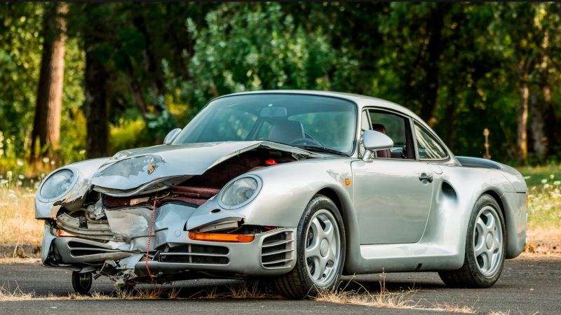 It’s gotta be a real downer to absolutely destroy the beautiful car you’re looking to sell. It’s gotta be even stranger to check out the Mecum Auctions site and find a 1987 Porsche 959 Komfort with a shitload of front-end damage without a single mention as to, uh, why the hell the passenger side front wheel is missing.