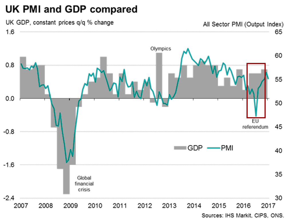 Strong growth — 0.7% quarterly — showed that fears of an immediate post-EU Referendum collapse were overblown. This chart (below) from IHS Markit told the tale best. The PMI survey — a poll of managers’ feelings about what company purchases they will make in the future — went in the opposite direction to the real economy, as highlighted in the red box. Everyone feared for the economy, but in fact the economy was doing really well: