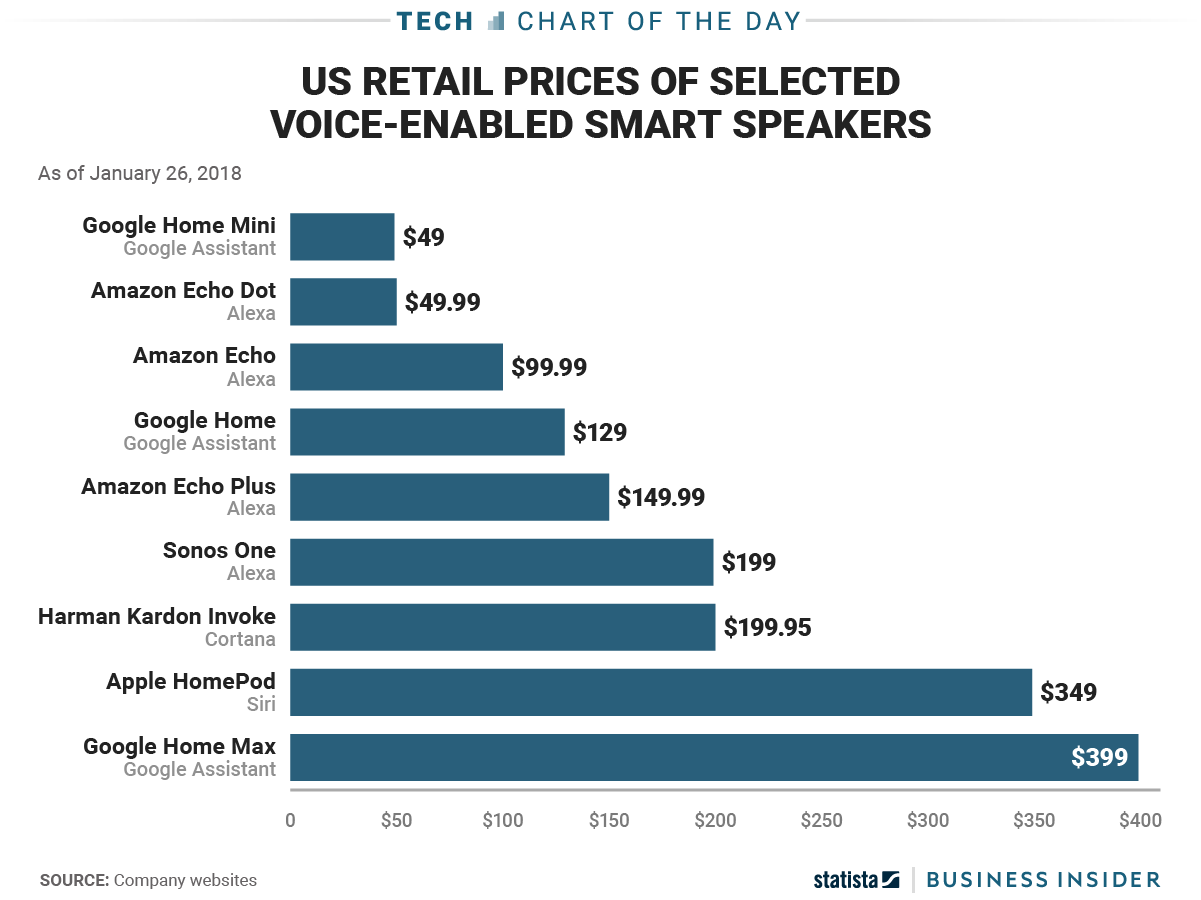 A similar dynamic is shaping up in smart speakers. Google joined the market in 2016, two years after Amazon debuted its pioneering Echo. Both companies have since added multiple devices to their lineups. And now other companies are jumping into the market, most notably Apple, which just started taking orders for its HomePod on Friday. As this chart from Statista shows, consumers can choose from a variety of smart speakers that come in a wide range of prices and capabilities.
