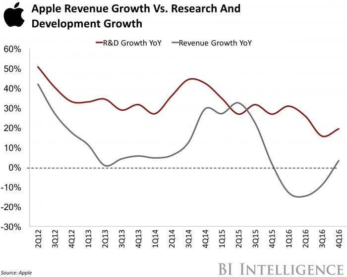 The company spent a massive $2.8 billion on R&D in Q4 2016, bringing the segment to nearly $10.5 billion in total for the year.