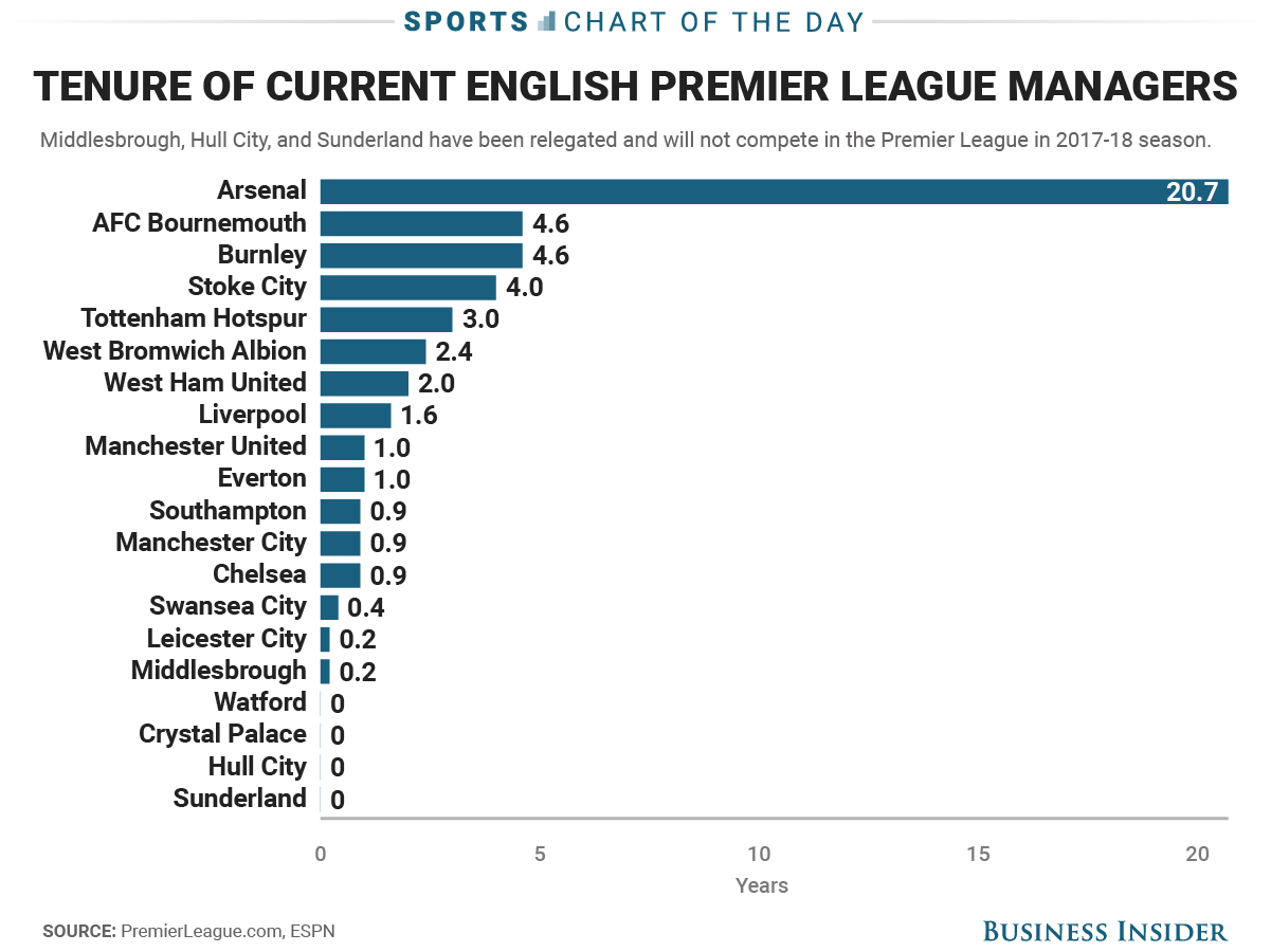 How long is that? The other 19 clubs that were in the Premier League this past season currently have managers with a combined tenure of 27.8 years. In addition, more than half (11 of 20) either currently don’t have a manager or have a manager who has been on the job for less than a year.