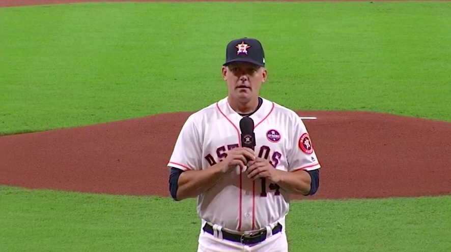 The Astros were due to play the New York Mets in a double-header Saturday, after the Astros organization asked the Mets if Friday’s game could be postponed so that both teams could volunteer as part of the relief efforts in Houston. Hinch thanked the Mets for “giving them a day off” in his speech.