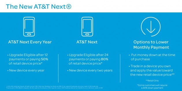 AT&T Next Year promises a yearly device upgrade with a 24-month financing program. So you can grab a new phone once you’ve paid for 50 percent of your current device. AT&T Next offers a similar setup with a longer 30-month finance plan and smaller monthly payments as a result. It offers the option to upgrade every two years or once you’ve paid for 80 percent of your phone.
