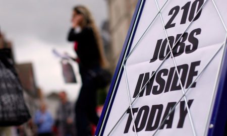 Shoppers walk past a newspaper advertising board promoting its job supplement in Leicester, central England, September 14, 2011.REUTERS/Darren Staples LONDON — Unemployment...