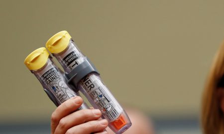 Mylan CEO Heather Bresch holds up an EpiPen while testifying on Capitol Hill in Washington, Wednesday, Sept. 21, 2016, before the House...