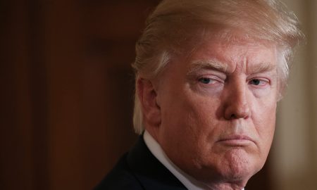 U.S. President Donald Trump stands during a joint press conference with Japanese Prime Minister Shinzo Abe at the White House on February...