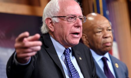 Democratic presidential candidate Sen. Bernie Sanders, I-Vt., left, accompanied by Rep. Elijah Cummings, D-Md., speaks during a news conference on the cost...