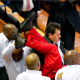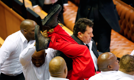 Security officials remove members of the Economic Freedom Fighters during President Jacob Zuma’s State of the Nation Address to a joint sitting...