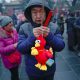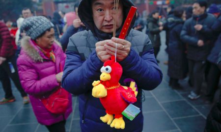 A man hold a rooster toy as people burn incense sticks and pray for good fortune at Yonghegong Lama Temple on the...