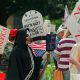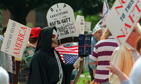A man calling himself “The Death of US Jobs” joins thousands of other people as they attend the “Not To This NAFTA”...