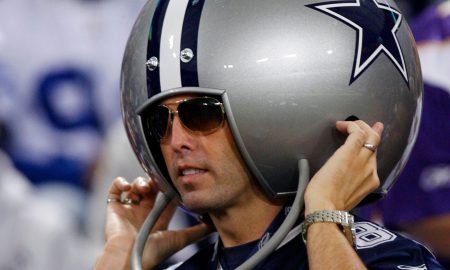 A Dallas Cowboys fan wears a giant helmet before the Cowboys play the Minnesota Vikings in their NFL Divisional playoff football game...