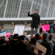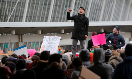 New York City Council Member Carlos Menchaca addresses a crowd during an anti-Donald Trump immigration ban protest outside Terminal 4 at John...