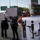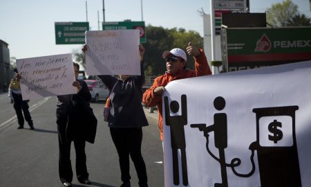 A protester gives a thumbs up to honking drivers as he and others angry over gas price hikes block a gas station...