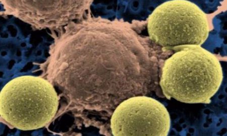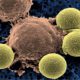 In this 2011 image, tiny beads (yellow) are used to force T-cells to divide before they are given to leukemia patients.University of...