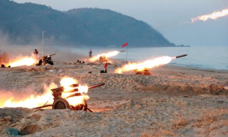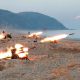 A view of a firing contest among multiple launch rocket system (MLRS) batteries selected from large combined units of the KPA, in...