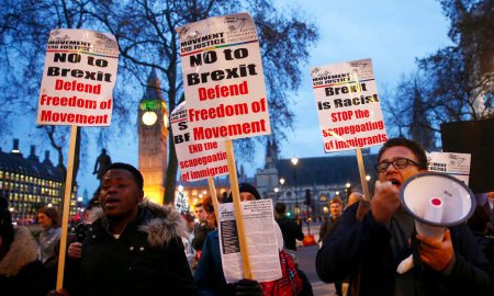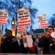 Protesters shout slogans and hold placards outside Supreme Court after the third day of the challenge against a court ruling that Theresa...