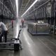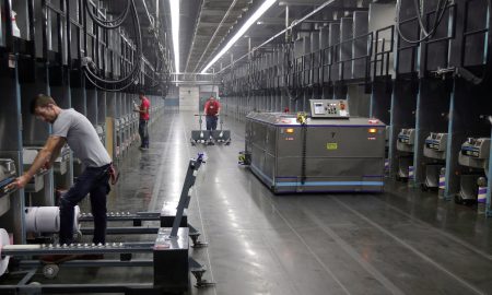Workers exchange spools of thread as a robot picks up thread made from recycled plastic bottles at the Repreve Bottle Processing Center,...
