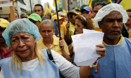 Venezuela is on the brink of political and economic collapse. An opposition supporter holds a prescription, as people protest against shortage of...
