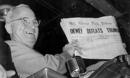 President Harry S. Truman with a copy of the Chicago Daily Tribune that, based on early results, mistakenly announced “Dewey Defeats Truman.”Byron...