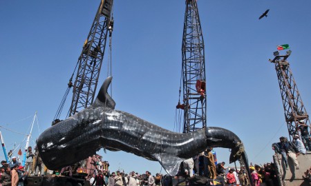 Akhtar Soomro/ReutersResidents gather as a whale shark is pulled from the water by cranes after it was found dead at Karachi’s fish...
