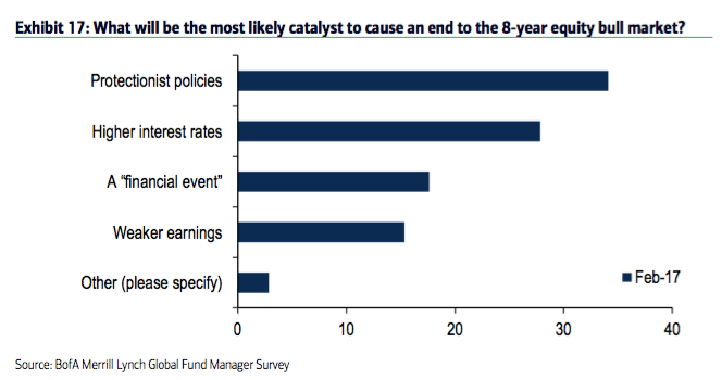 According to the Bank of America Merrill Lynch Global Fund Manager Survey, published February 14, investors ranked protectionist policies as the number one risk to the eight-year equity bull market, ahead of high rates, a “financial event” and weaker earnings.
