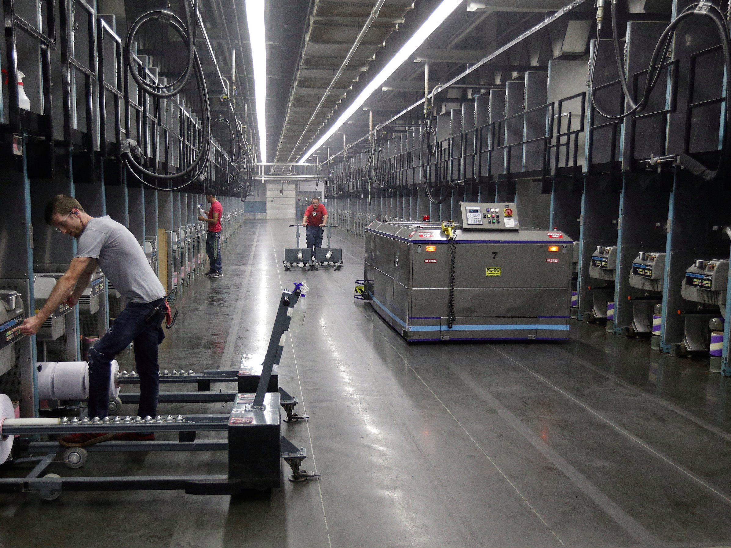 Workers exchange spools of thread as a robot picks up thread made from recycled plastic bottles at the Repreve Bottle Processing Center, part of the Unifi textile company in Yadkinville, N.C., Friday, Oct. 21, 2016.AP Photo/Chuck Burton
