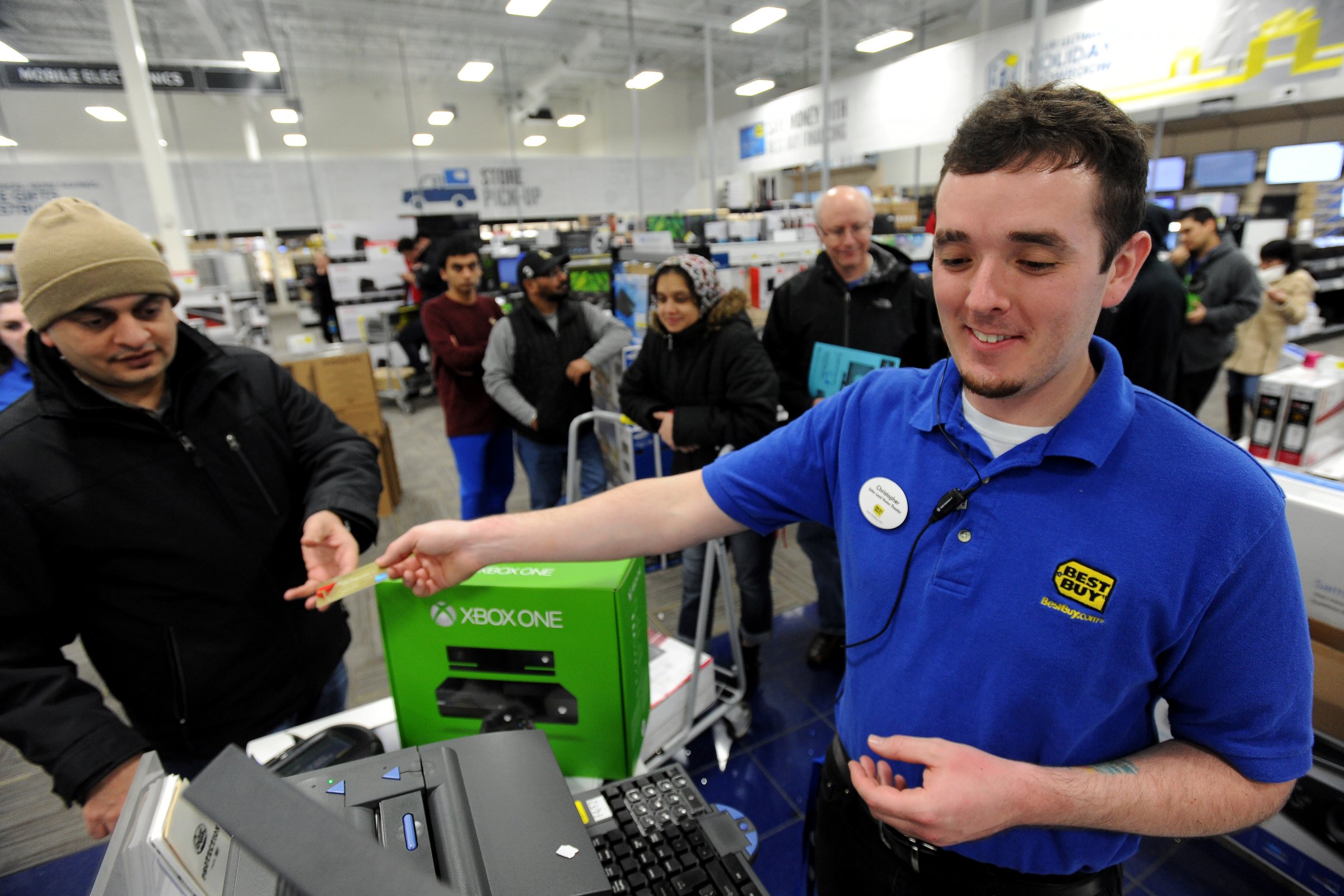 Just after midnight, Best Buy employee Christopher Gervais, right, hands back a credit card after he rang up a Xbox One game set.AP Photo/David Tulis