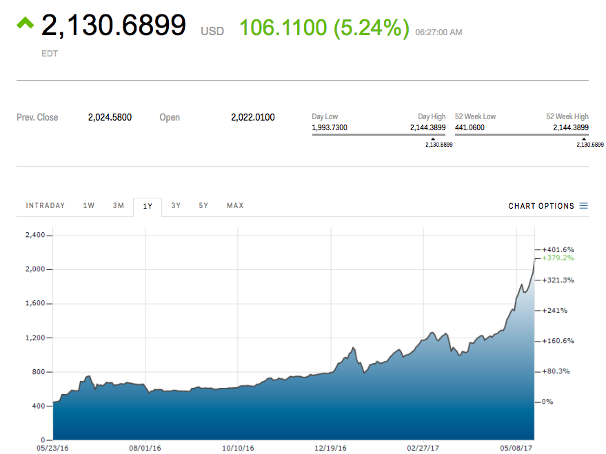 The cryptocurrency topped both $2,000 and $2,100 for the first time Sunday night and Monday morning. It’s now trading up by $106.11, or 5.2%, at $2,130.69 a coin.