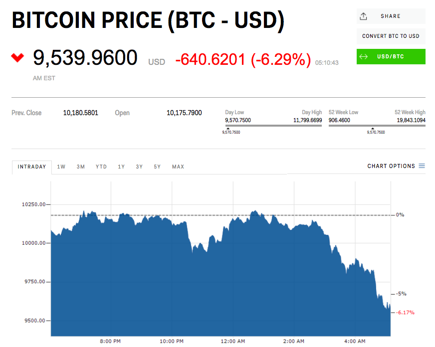 - As of 10.10 a.m. GMT (5.10 a.m. ET) the largest cryptocurrency is down around 6%.