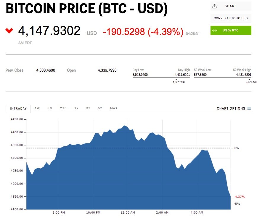 Bitcoin is down over 4% against the dollar to $4,147.93 at the time of writing (11 a.m. BST, or 6 a.m. ET).