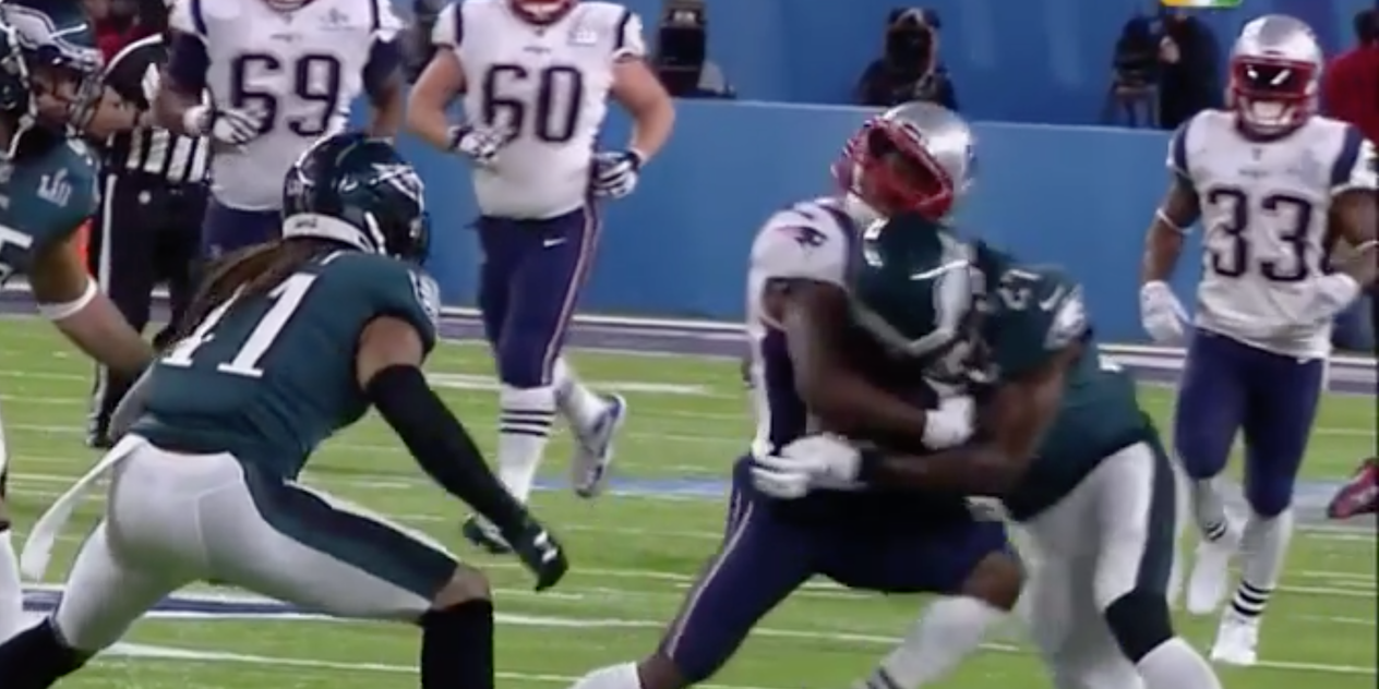 After catching a deep pass from Tom Brady, New England Patriots wide receiver Brandin Cooks looked to evade defenders when Philadelphia Eagles cornerback Malcolm Jenkins blindsided him.
