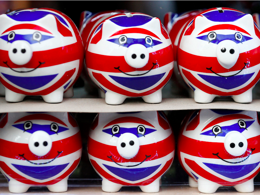 Smiling Union Jack piggy banks are lined up for sale in the window of a souvenir store on Oxford Street in central London January 20, 2014.Reuters / Andrew Winning