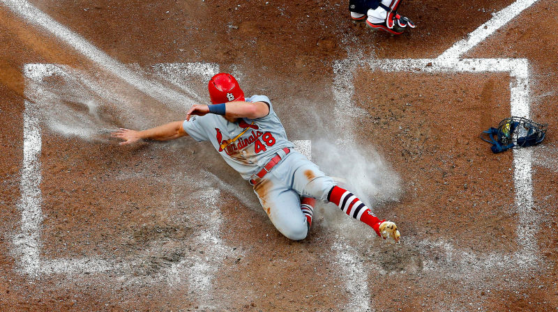 Atlanta’s 3–1 lead, which held up into the eighth inning, was largely the result of luck. Josh Donaldson got on with one away in the sixth when a Tyler Webb fastball glanced off his pinky. A Nick Markakis grounder, hit more or less exactly at Cardinals first-baseman Paul Goldschmidt, became a double when the ball took an unexpectedly loopy bounce 10 feet in the air and into shallow right. On exactly zero well-hit balls, the Braves had runners in scoring position with one down.