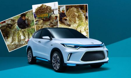 A Chinese-market Guangqi-Honda with photos of Chinese farmers with stockpiles of leeks from the 2001 trade dispute. Photo Credits: Honda, Getty Images...