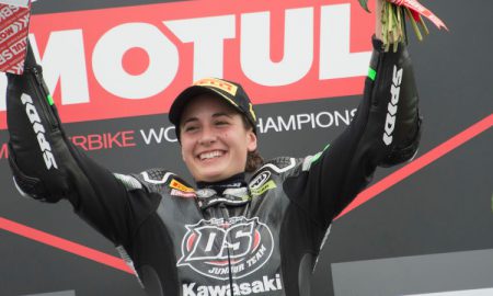 Ana Carrasco on the podium at Donington Park earlier this year. Photo: Mirco Lazzari gp (Getty Images) Women are showing the boys’...