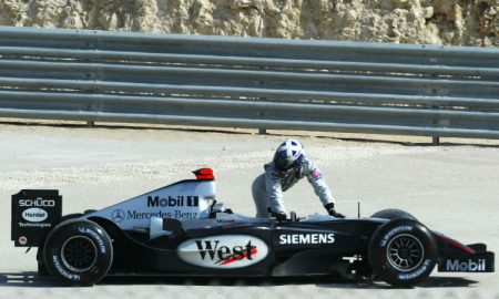 David Coulthard after spinning out in practice at the 2004 Bahrain GP, later to become controversial when F1 continued amidst the country...