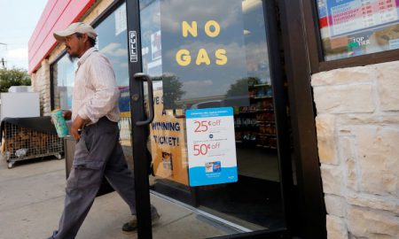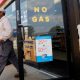 A customer walks out of an Exxon filling station and convenience store where a sign on the door reads “No Gas,” Thursday,...
