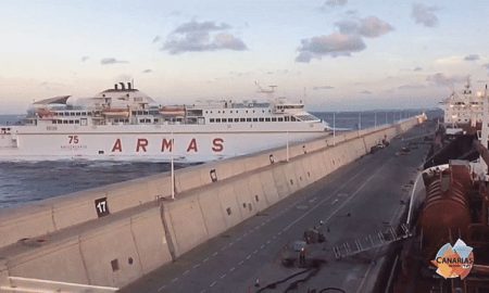 GIF Watch in silent horror as this decently big Armas ferry decides to turn left, almost immediately crashing through the massive concrete...