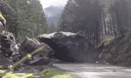 GIF Humans conquering nature by blowing up a huge fuckin rock in Oregon (GIF made from a video by the Oregon Department...