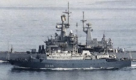 The Vishnya-class intelligence ship Kareliya, similar to the Leonov, next to the U.S. Navy cruiser USS Texas back in 1988. Photo credit:...