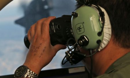 In this March 22, 2014, file photo, Flight Officer Jack Chen uses binoculars at an observers window on a Royal Australian Air...
