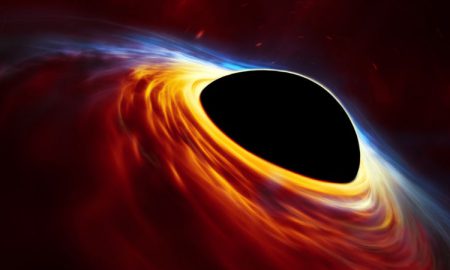 Artist’s impression of a rapidly spinning supermassive black hole surrounded by an accretion disc—one consisting of the shredded remains of a Sun-like...