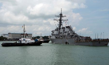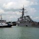 In this Aug. 21, 2017 photo, tugboats from Singapore assist the guided-missile destroyer USS John S. McCain as it steers towards a...